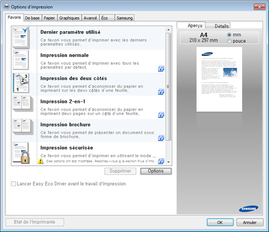 : utilisez les paramètres de Syncthru™ Web Service ou de Samsung Easy Printer Manager. Avant de sélectionner cet élément, vous devez configurer la fonction économique dans SyncThru™ Web Service (onglet > > > ) ou Samsung Easy Printer Manager ( > ).