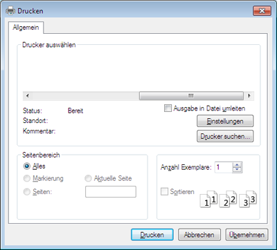 Wählen Sie die Anzahl der Exemplare und geben Sie an, welche Seiten Sie drucken möchten.