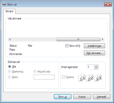 De grundläggande utskriftsinställningarna, som antalet kopior och utskriftsområde, väljs i fönstret .