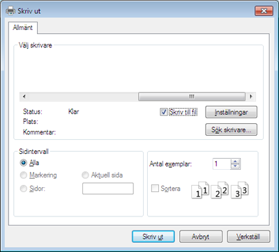 Öppna ett program och välj från menyn . Maskinnamnet som visas i fönstret med skrivaregenskaper kan skilja sig beroende på vilken maskin som används. Förutom namnet ser fönstren med skrivaregenskaper ungefär ut som följande.