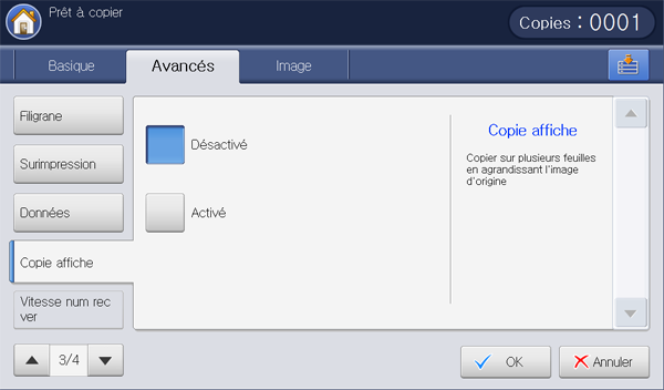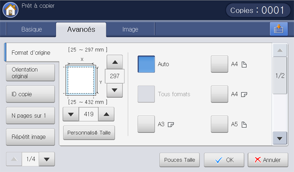 Définissez les caractéristiques de copie dans les onglets ou , si nécessaire (voir Utilisation des fonctions de copie spéciales).