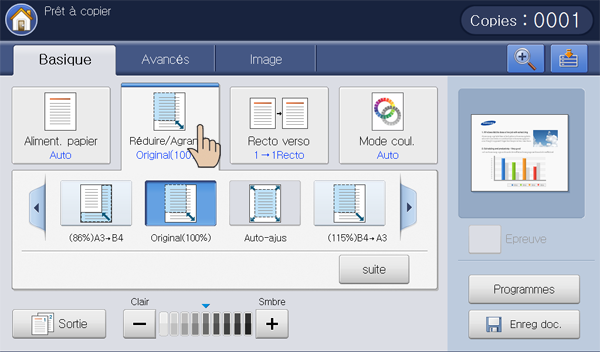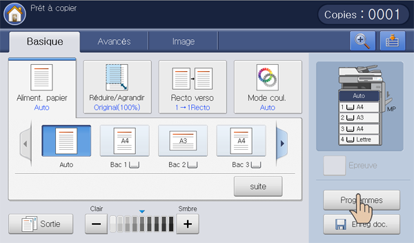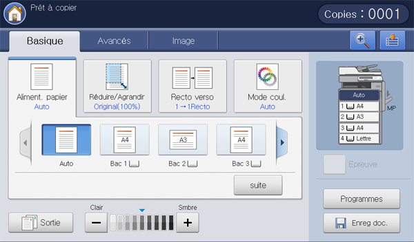 L’onglet de l’écran permet de sélectionner les fonctions de copie avant le lancement d’une tâche.