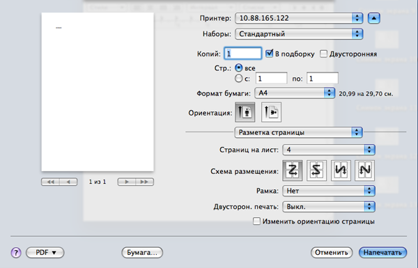 : выбор количества страниц, печатаемых на одной стороне листа (см. Печать несколько страниц на одной стороне листа бумаги).