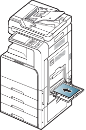 Tulostusmateriaalit on lisättävä tulostuspuoli alaspäin siten, että yläreuna syötetään monitoimipaperilokeroon ensin. Ne on sijoitettava paperilokeron keskelle.