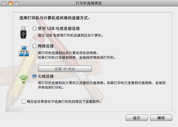 完成无线网络连接后,需要安装打印机驱动程序才能从应用程序进行打印(请参见Mac 安装)。 |