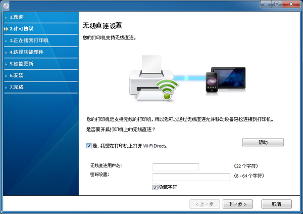 设置无线直连后,您需要下载移动打印应用程序(例如:Samsung Mobile 打印机)以便从智能手机上进行打印。