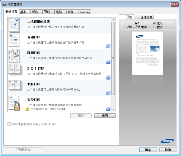: 按照 Syncthru™ Web Service 或 Samsung Easy Printer Manager 的设置操作。选择该项之前,您必须通过 SyncThru™ Web Service(选项卡 > > > )或 Samsung Easy Printer Manager( > )设置环保功能。