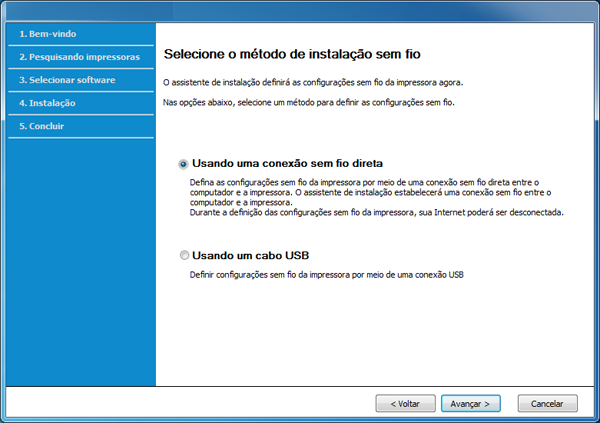 Durante a configuração da rede sem fio, o equipamento usará a LAN sem fio do PC. É possível que você não consiga se conectar à Internet. |