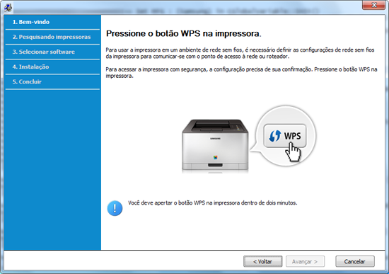 Se a tela abaixo aparecer, pressione o botão (WPS) no painel de controle dentro de 2 minutos.