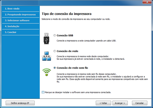 Depois de concluída a conexão da rede sem fio, será preciso instalar um driver para imprimir em um aplicativo (consulte Instalando o driver pela rede). |