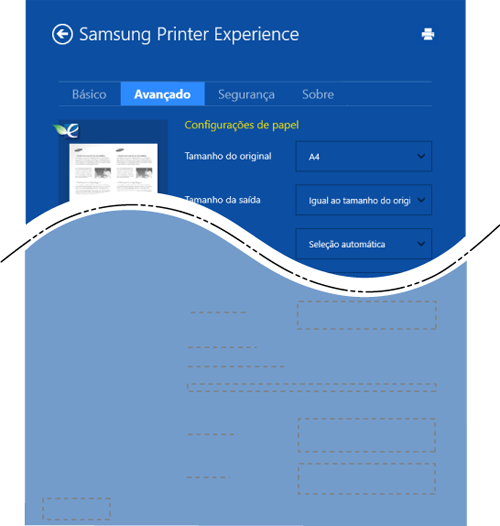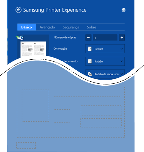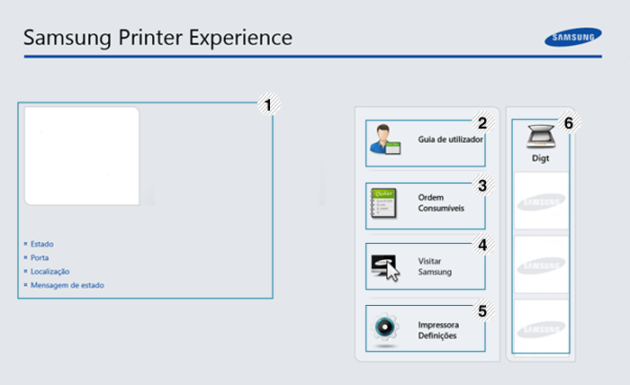 O Samsung Printer Experience é um aplicativo da Samsung que combina gerenciamento e configurações de equipamentos em um único local. Você pode definir configurações de dispositivos, fazer pedidos de suprimentos, abrir guias de solução de problemas, acessar o site da Samsung e verificar informações do equipamento conectado. Este aplicativo será automaticamente baixado da do Windows se o equipamento estiver conectado a um computador com Internet.