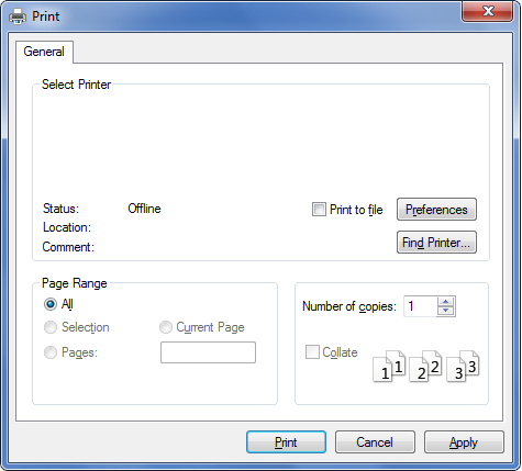 The basic print settings including the number of copies and print range are selected within the window.