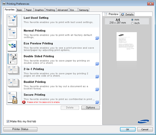 If you press the button from the control panel, Eco mode is enabled. The default setting of Eco mode is duplex printing (long edge), multiple pages per side (2-up), skip blank pages, and toner save. Some features may not be available depending on model.