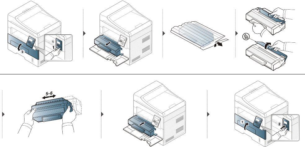 of the toner cartridge. Use the handle on the cartridge