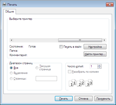 В окне находятся основные настройки печати: число копий и диапазон страниц для печати.